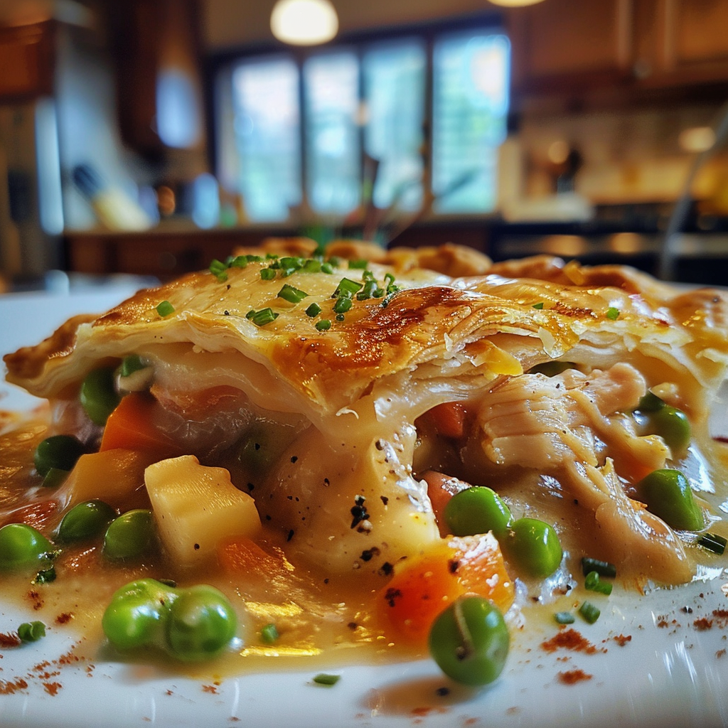 - The flaky crust envelops tender chicken and vegetables, creating a warm hug on your plate