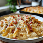 Creamy Bacon Cheese Pasta Bake is a comforting, indulgent dish that combines perfectly cooked pasta with a luscious cheese sauce and crispy bacon. This family-friendly recipe is not only easy to whip up but also guaranteed to be the highlight of your gathering. With its inviting golden crust and rich flavors, it’s perfect for cozy dinners or casual get-togethers.