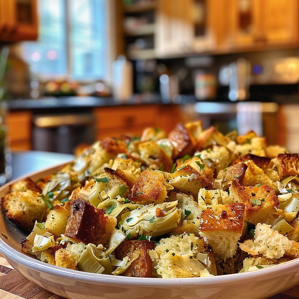 Warm your heart and home with this delightful sourdough and artichoke stuffing. Perfect for holidays or cozy nights, this dish combines the richness of toasted sourdough with savory artichokes and fresh herbs, creating a mouthwatering experience that will have everyone coming back for seconds.